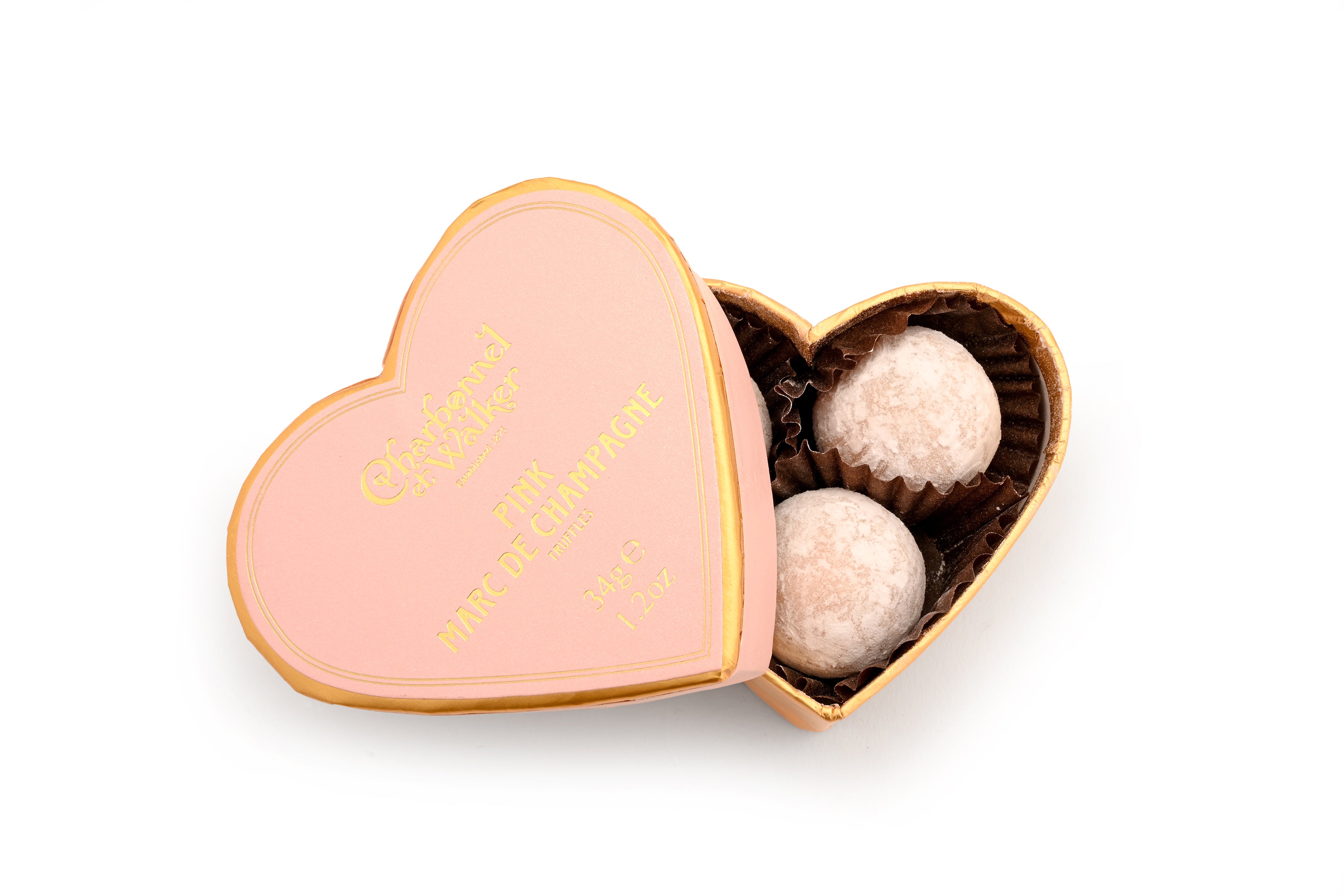 A beautifully presented heart-shaped gift box filled with iconic Charbonnel et Walker Pink Marc de Champagne chocolate truffles — a timeless expression of indulgence and romance.