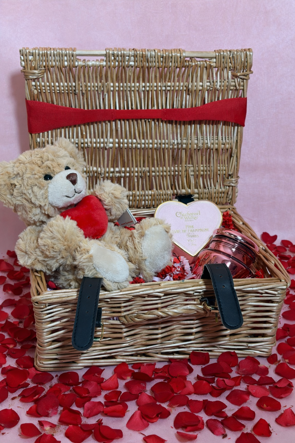A Teddy Hermann teddy bear, holding a soft red heart, offers a timeless symbol of affection — a keepsake designed to be cherished long after the chocolates are enjoyed. Nestled alongside is a Charbonnel et Walker Milk Marc de Champagne Truffle Heart, a much-loved classic known for its smooth, melt-in-the-mouth texture and celebratory flavour. Completing the trio is a rose-toned glass candle, adding a gentle glow and a moment of calm to evenings in.