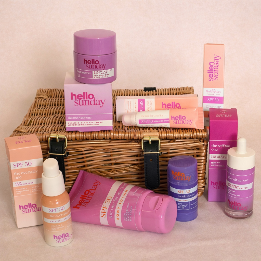 A beautifully curated Hello Sunday wicker gift set, an ideal gift for radiant, everyday skin protection.