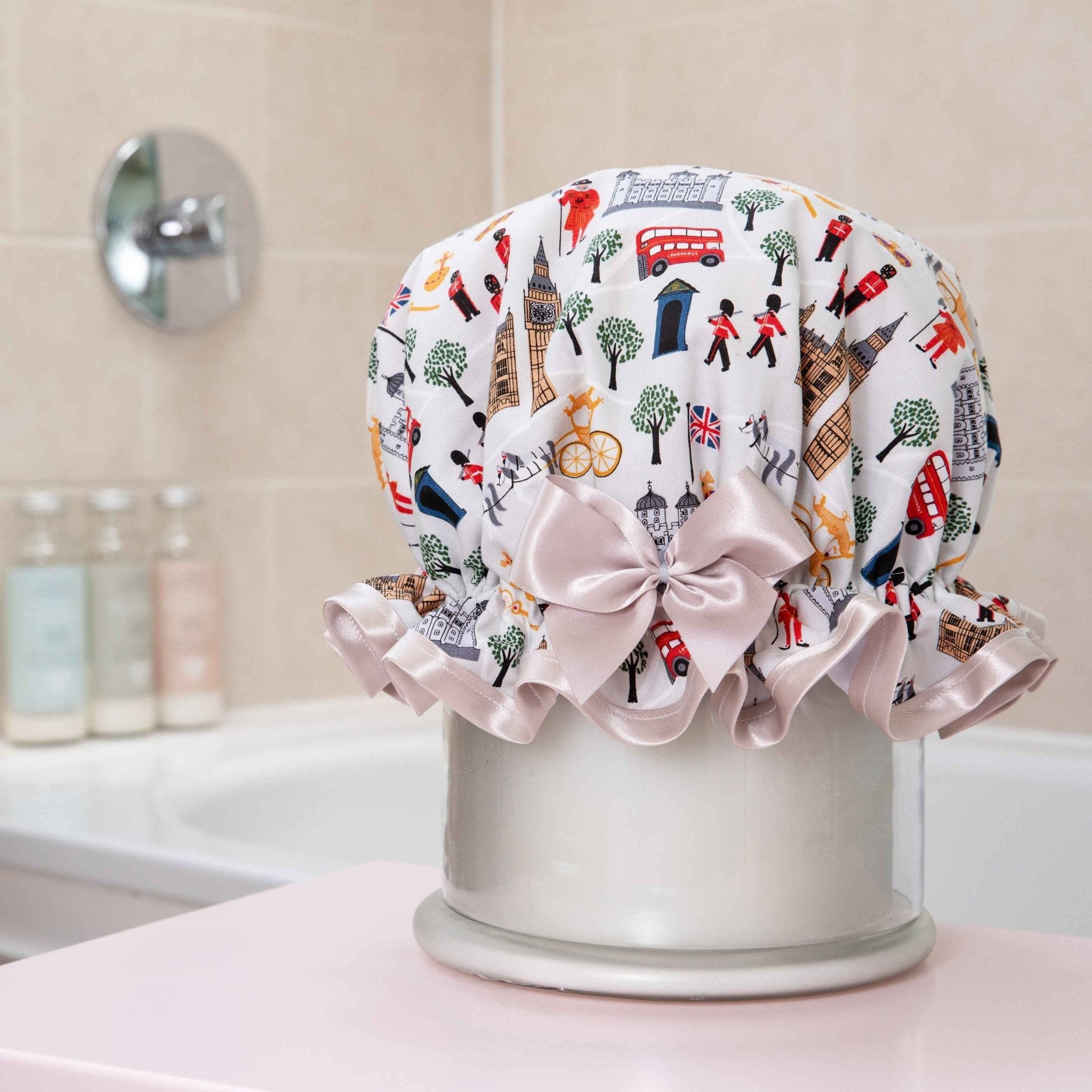 Step into your self-care routine with a touch of luxury. This gorgeous shower cap is lovingly handmade and fully waterproof, featuring a silky London features design satin outer and a soft waterproof nylon lining to keep every strand perfectly protected.