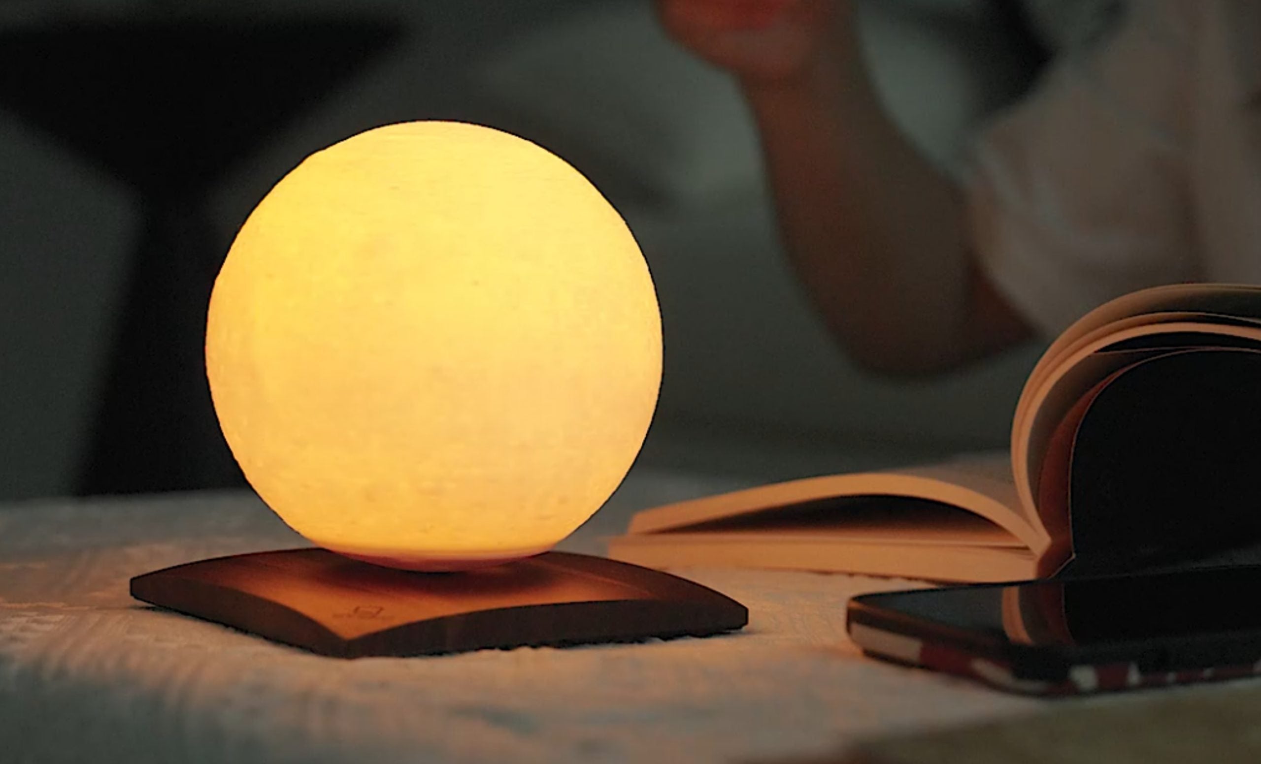 Resting on a beautifully crafted walnut wood base, the moon levitates and rotates using advanced magnetic technology, wirelessly charging as it spins. Lift it gently from its base and place it on a surface — or even in your hands — and it continues to turn slowly, creating a captivating moment of light and movement.
