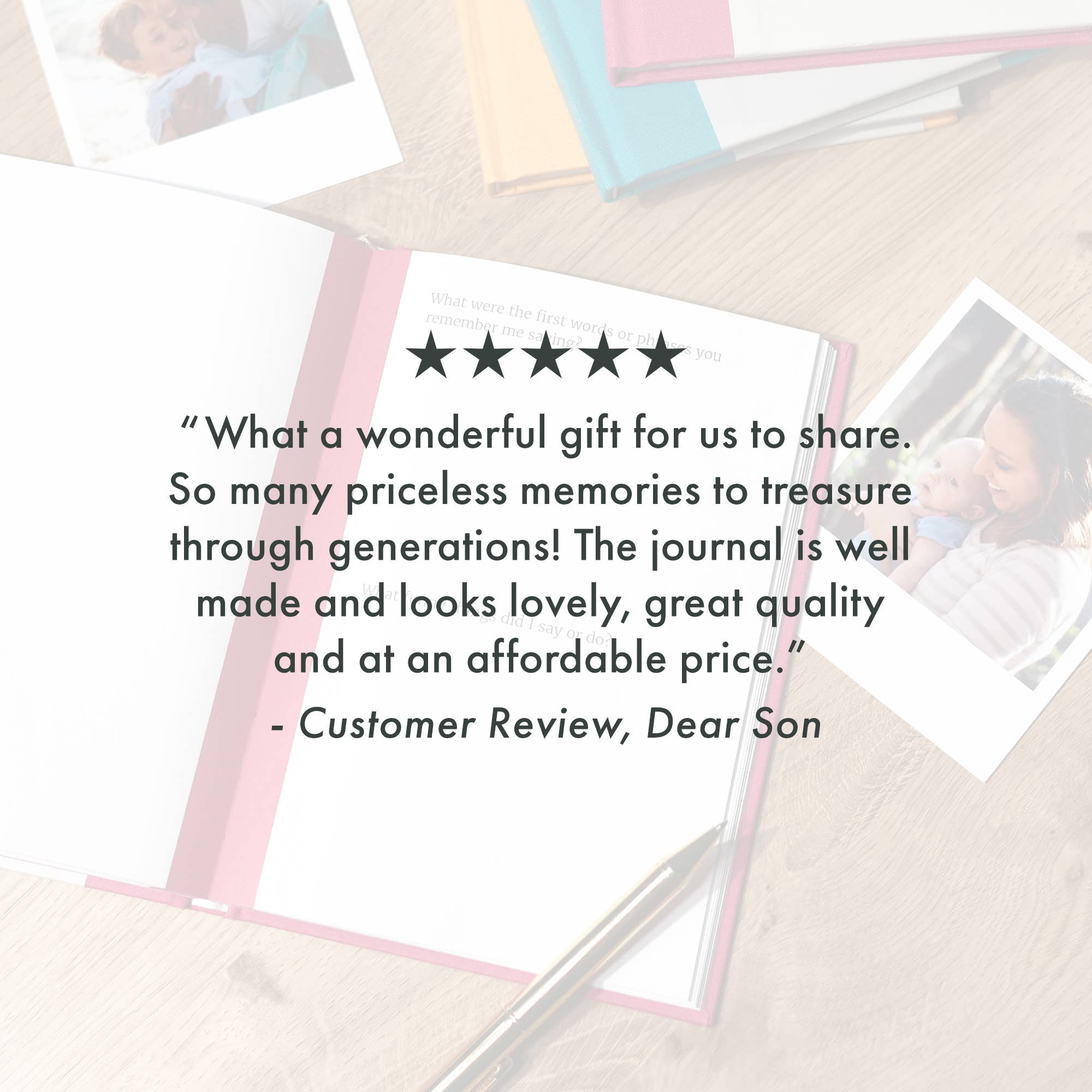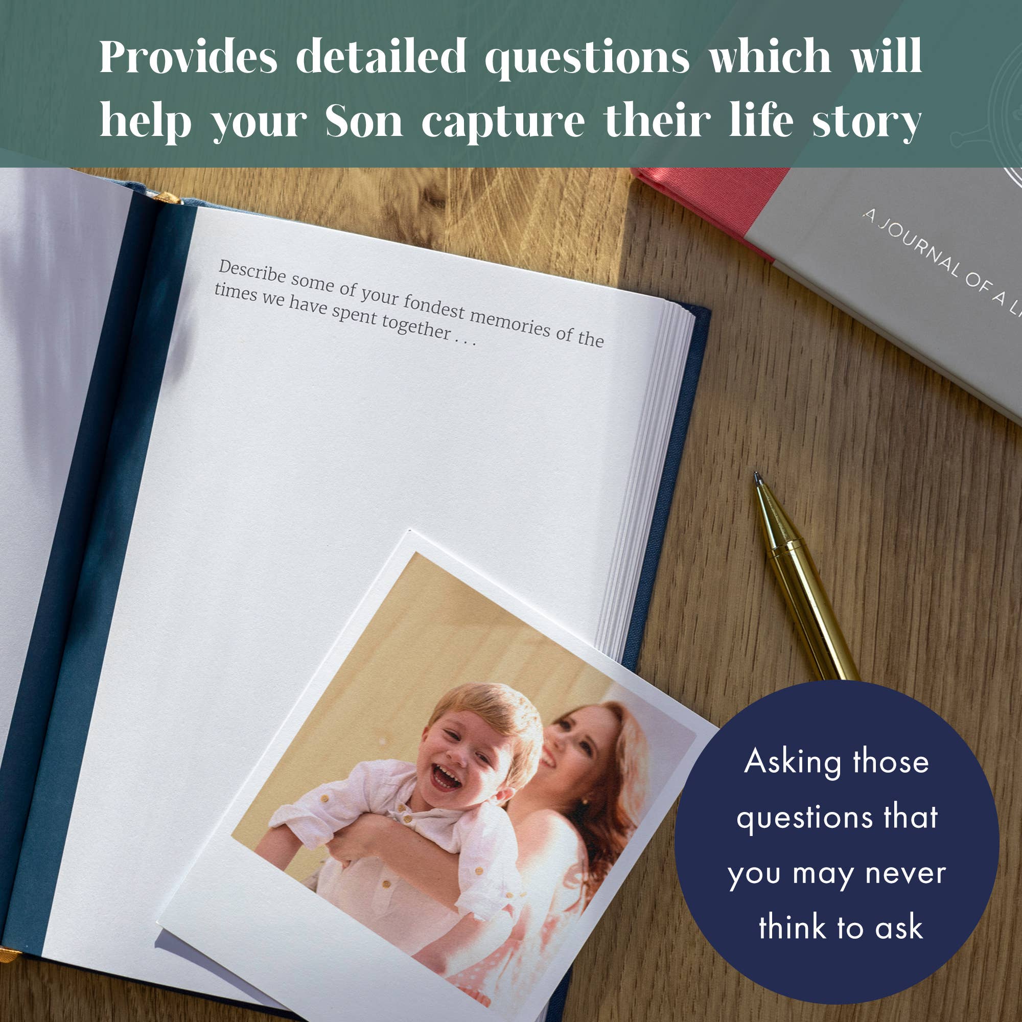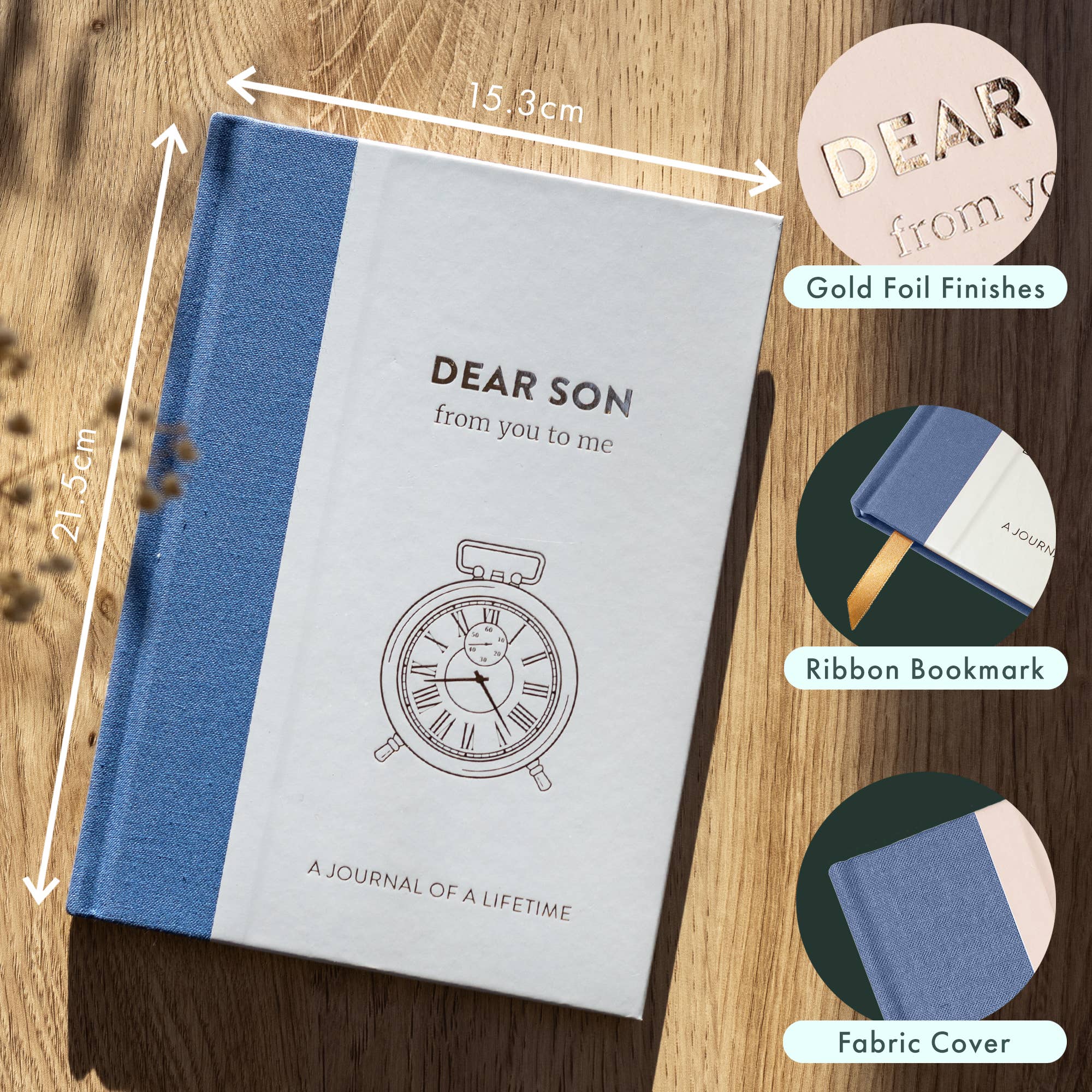 A beautifully designed fabric-covered journal, finished with elegant gold foil blocking, created to help your son capture and share his memories, stories and aspirations in a way that feels personal and lasting.