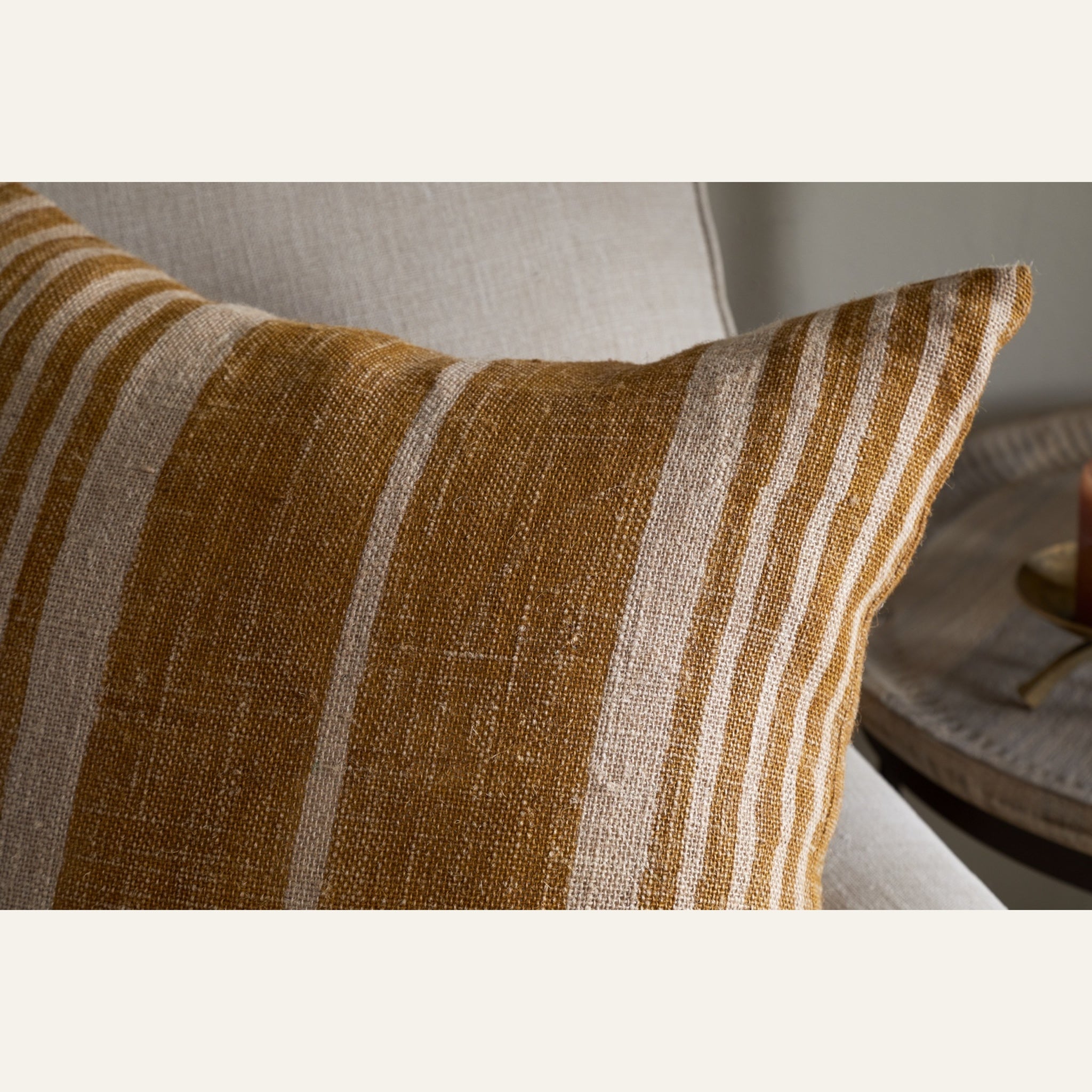 Once woven, the cushion is hand block-printed by skilled makers, applying the striped design using techniques passed down through generations. The soft sage green tone adds depth and a natural, earthy warmth, making it easy to style across both modern and rustic interiors.